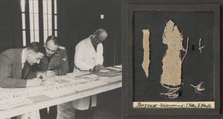 Mesurant quelques centimètres, ces deux fragments de toile de lin, sans broderie, ont été vraisemblablement prélevés en 1941 par le Dr. Karl Schlabow, alors directeur du musée de Neumunster et spécialiste des textiles anciens. Il était membre de l’équipe de l’Ahnenerbe, un institut scientifique œuvrant à la recherche d’un « héritage ancestral ». Dirigée par Herbert Jankuhn au cours de l’été 1941, cette mission très spéciale portait sur l’étude approfondie de la Tapisserie de Bayeux. Karl Schlabow, lui, était en charge d’analyser les matériaux de l’œuvre.